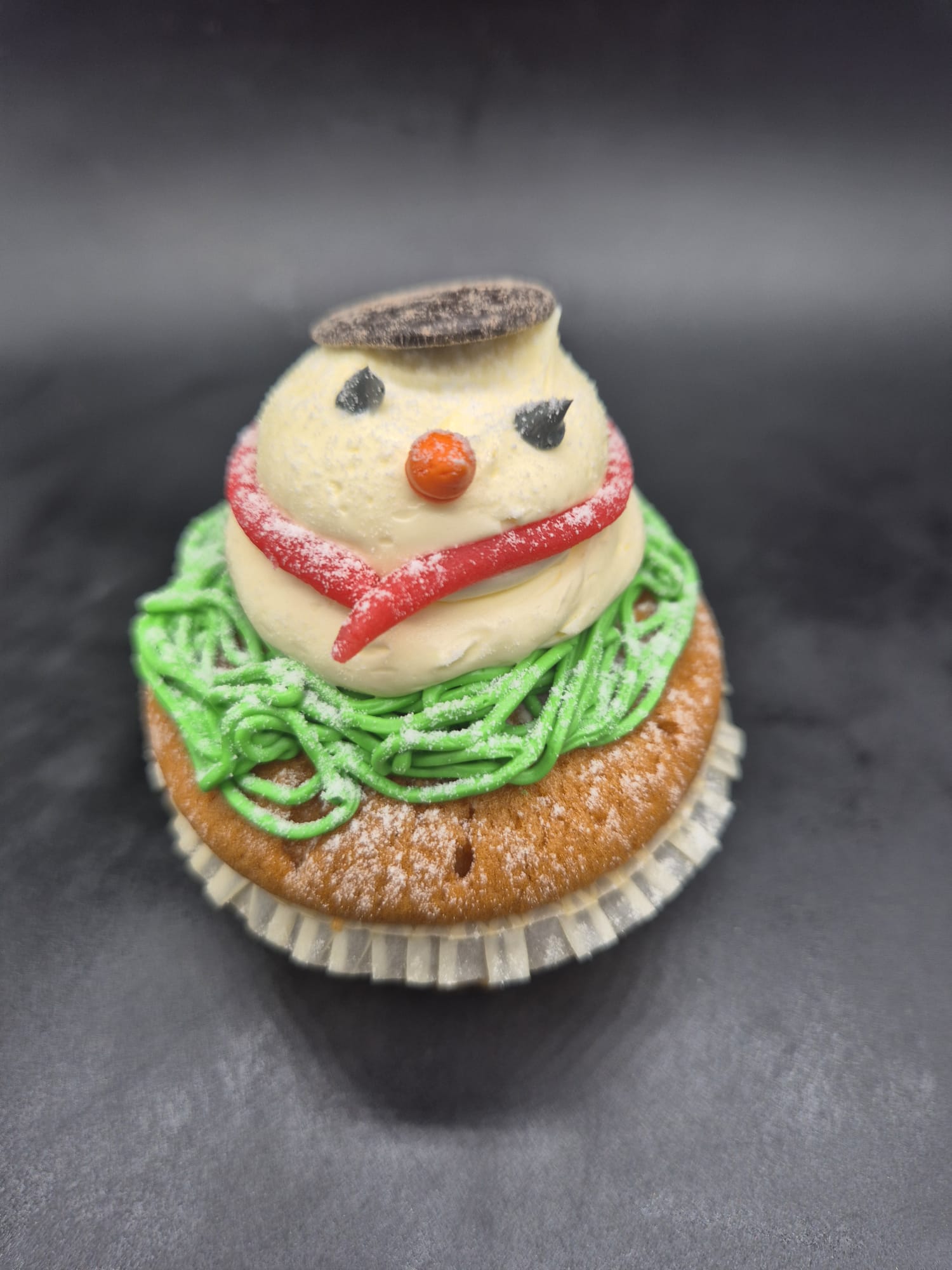 Vrolijke Sneeuwpop cupcake, op vanille smaak basis,